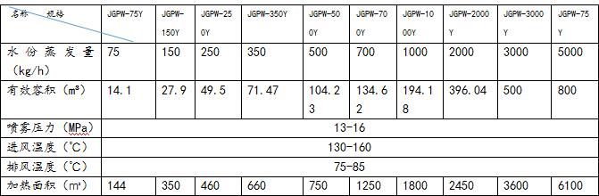 JGPW-Y型壓力噴霧干燥機組主要技術參數