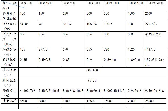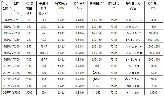 JGPW-L型離心噴霧干燥機組主要技術參數